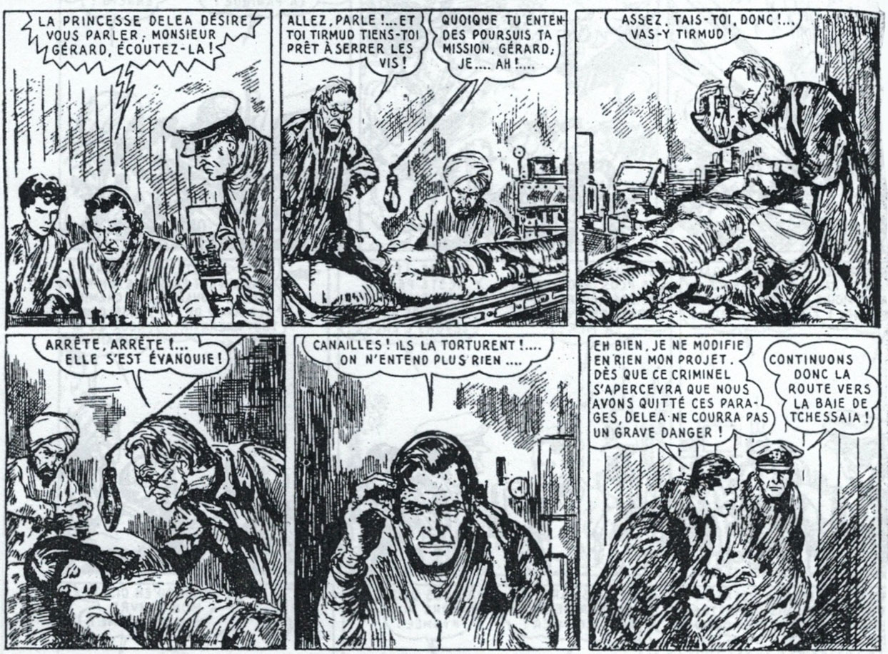 For L'Audace (1939) and then Topolino (1939-1940), Molino co-created his best-known comic, the sci-fi adventure serial 'Virus, il Mago della Foresta Morta' ("Virus, the Wizard of the Dead Forest", 1939-1940). Written by Federico Pedrocchi, the serial stars the engineer Roberto and his nephew Piero as opponents of the mad scientist Virus. Working with his Indian servant Tirmud in a sinister lab in a petrified forest, Virus uses telepathic communication and futuristic technology in his quest for world domination. He has a teleportation machine and is able to bring ancient Egyptians back to life. A product of its time, the boy character Piero was a symbol for Italian persistence and the fascist ideology.