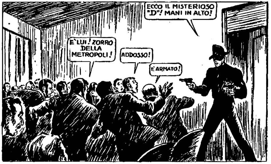 In 1937, Walter Molino began his collaboration with the publisher Arnoldo Mondadori, who was then still operating under the banner Anonima Periodici Italiana (API). Molino's first serial was 'Zorro della Metropoli' ("Metropolis Zorro", 1937), about a masked vigilante leading a revolt against a vicious landowner in a small western village. Although serialized in Paperino, Mondadori's new magazine named after Walt Disney's Donald Duck, Molino's feature predated Disney's Zorro and was not related to this American pulp hero. The scriptwriter was Cesare Zavattini, with whom Molino also made 'La Compagnia dei Sette' ("The Company of the Seven"), published in the 1938 and 1939 volumes of the Almanaccco Topolino. Years later, in 1948, this feature about an adventurous gang of kids was concluded in a third episode, written by Federico Pedrocchi and drawn by Raffaele Paparella for Topolino magazine. In 1945, a novel series with the same characters by Pedrocchi and illustrated by Carlo Cossio was published by Carroccio.