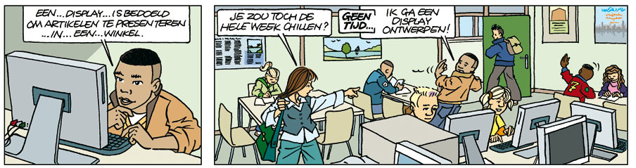 After his education, Mommers spent six years working for advertising agencies, starting with De La Mar (later Intermarco/De La Mar) in Rotterdam. Together with his art director from this agency, he developed a comic based on Greek mythology, called 'Mythos en Papyros', but the project was never finished. Through Intermarco Rotterdam, Mommers was assigned to draw twelve newspaper advertising strips for General Electric. In late 1973, his creation 'General Electric en de Wakkermakers' ran in several newspapers. The experience prompted Mommers to become a self-employed cartoonist and comic artist in the following year.