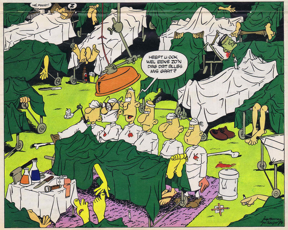 In 1974, Mommers had four one-page stories published in the comic magazine Pep. Between 1976 and 1978, he was subsequently a cartoonist for Motor magazine. Some of his comic strips were made in collaboration with his brother-in-law Jan Schrijver, who among comic fans is best-known as the writer of the 'Max Laadvermogen' comic for Kees de Boer (1987-1988). The most notable collaboration between Mommers and Schrijver was the 'Kanis W. Lupus' feature. Although the comic featured several popular fairy tale characters out of their original context, the main anti-hero was the wolf from the Little Red Riding Hood tale, who never seems to make it to Grandma's house. After unsuccessfully trying to pitch their idea to Pep's successor magazine Eppo, they had more luck with the Malmberg school magazine Taptoe, which ran the feature in their 1980-1982 issues. In 2010, episodes of 'Kanis W. Lupus' were reprinted in John Croezen's digital comic magazine Kwynk.