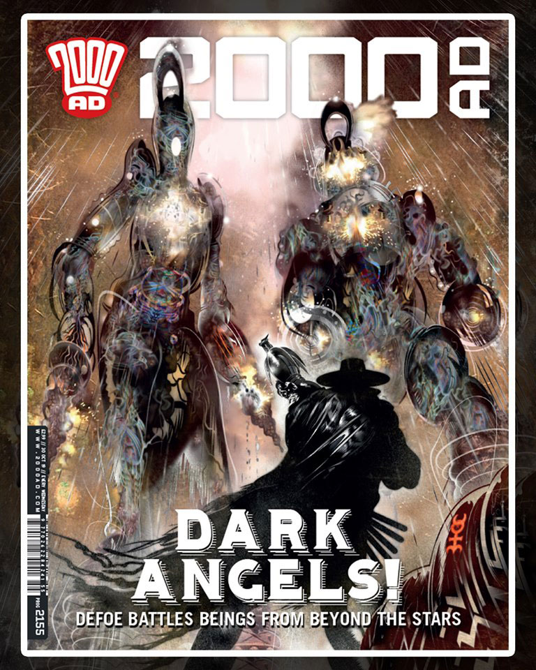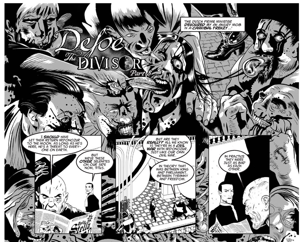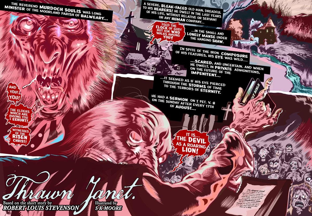 In addition, S.K. Moore created 'The Tragedy of Macbeth' (2016), a graphic novel based on the stage performance of 'MacBeth' by the Prague Shakespeare Company. The 114 page book began as a #28DayGraphicNovel Twitter challenge to illustrate 'Macbeth' in just 28 days, but Moore's dark and moody black-and-white rendition certainly didn't suffer under the tight deadline. Between 2016 and 2018 Moore worked for David Lloyd's digital comic anthology Aces Weekly on 'The Boötes Void' and an adaptation of R.L. Stevenson's 'Thrawn Janet'. By 2019 he teamed up with scriptwriter Pat Mills to illustrate 'Defoe: The Divisor' (2019), a new chapter in Mills' steampunk zombie fantasy set in 17th-century London for 2000 AD. The character Titus Defoe was originally created by Mills and artist Leigh Gallagher in 2007. For the occasion, Moore switched to a more Baroque artistic approach, fitting for the time period he wanted to evoke.