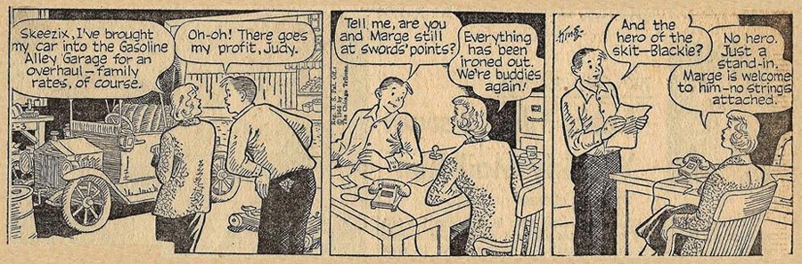 Moores also introduced many new characters and focused more on them instead. Among them were Rufus the dim-witted handyman and his brother Magnus, a lowlife who was often seen in jail. Rufus is often seen in the company of his cat, Kitty, and his best friend Joel the junkman. Joel too has a pet: his mule Becky. Rufus' girlfriend, Miss Melba - who'd later become mayor of Gasoline Alley - was also created by the artist. Moores explained in an interview that he liked Rufus and Joel because of their Laurel & Hardyesque possibilities as a comedic duo.