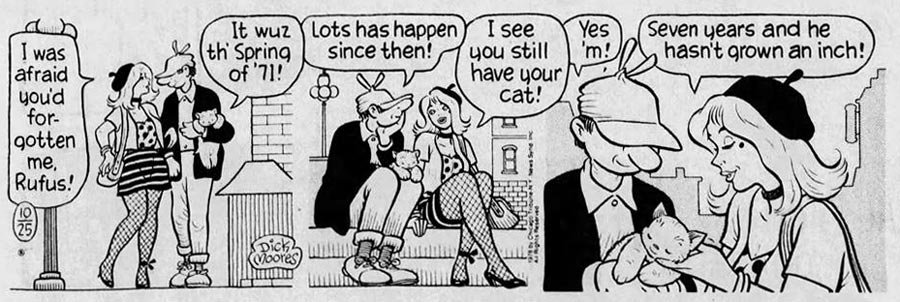 Just like King, Moores continued the family saga of Walt Wallet, his wife Phyllis and their ever-expanding offspring. Skeezix, who'd served in the U.S. army during World War Two, now saw his son, Chipper, do the same during the Vietnam War (1965-1973). Skeezix' daughter, Clovia, married Slim Skinner on 31 May 1977. Slim, a not-too-bright man, provided a lot of frustration for her, but comic relief for readers at the same time. Cloovia and Slim would adopt two neglected children in the years beyond. The girl Gretchen made her debut on 13 April 1978, while the boy Rover Bump was first introduced to readers on 1 December 1983. If their household wasn't busy enough, the family also took two dogs in, namely Kleine the Doberman Pinscher and Sieg the Great Dane. Meanwhile, Walt and Phyllis' other son, Corky and his wife Hope Hassel, would have a boy of their own, Adam, born on 21 April 1960. Walt's adopted daughter, Judy, married Gideon Grubb on 4 May 1961 and had a son with him on 27 June 1966.