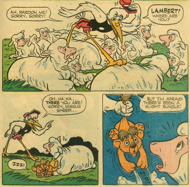 In September 1953, Moores adapted the animated short 'Lambert, The Sheepish Lion' (directed by Jack Hannah) into a comic story, published in book format by Western Publishing. Between 5 August and 30 September 1956, a Sunday comic adaptation of 'Lambert, The Sheepish Lion' was launched, scripted by Frank Reilly and drawn by Floyd Gottfredson