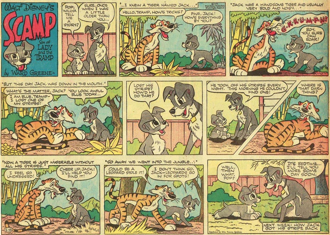 Of all comics ever created around a character from a Disney movie, 'Scamp' is the most perplexing. The dog was only seen during the final five minutes of the film and didn't even have a speaking line, nor a name! But since he was a puppy dog, publishers considered him suitable enough to carry his own title. On 31 October 1955, four months after the film premiered, the first 'Scamp' daily strip was published in newspapers, drawn by Moores. A Sunday page was launched the following year, in January 1956, by the same team. Greene and Moores collaborated on three continuing stories with Scamp, his sisters, parents and the other canine characters from the movie until April 1956. From then on, the comic switched to a gag-a-day format, mostly dealing with Scamp's amazement when meeting other neighborhood animals. Both Greene and Moores however left the comic around the same time.