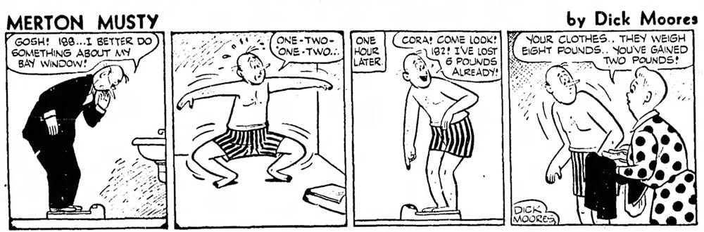 During the period 1948-1953, Moores created the equally obscure comical newspaper feature 'Merton Musty', which appeared in a couple of California newspapers. The 1948 episodes have a copyright notice for the unknown "Artists Associated Syndicate", but it could be a Telecomics production as well. The strip was apparently part of a series of newspaper strips moonlighted by Disney studio artists and animators as a side project. Other features included were 'Holly Wood' by Gil Turner, 'Milford Muddle' by Jack Bradbury and/or Ray Patin, 'Pam' by Gus Jekel, 'Sleepy Holler' by Jerry Hathcock, 'Animal Antics' by Bob Dalton, 'Sidetrack' by Dick Shaw, and a humor panel by Bob Karp. The author of 'Life with a wife' ("Mitchell") is still not known. Also featured was 'Pepe', most likely the Mexican comic strip 'Pedrito' by William de la Torre ("Will"). Some late 1950 episodes of 'Merton Musty' are drawn/signed by a certain "James".