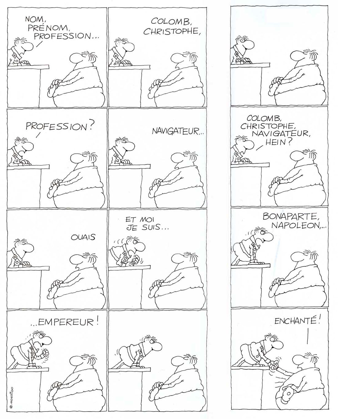 Rare Mordillo strip with dialogue. The man claims to be Christopher Columbus, to which the interrogator sarcastically answers: "Yes, and I'm emperor Napoleon." The Columbus imposter then calmly replies: "Honored to meet you!".