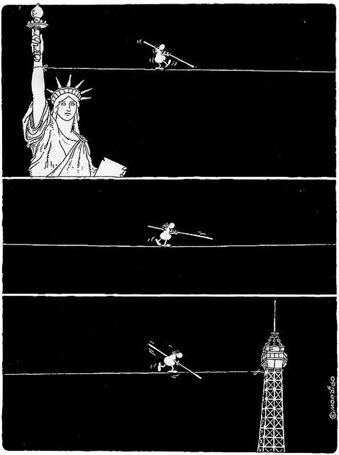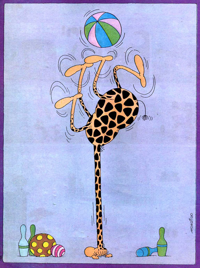 After his brief stay in the United States (1959-1963), Mordillo decided to move to Europe. He arrived in Paris on 19 September 1963. His skills in designing greeting cards got him a job at Éditions Mic-Max, but by 1966 he was fired and contemplated a humiliating return to his home country. At this low point of his life, one of his friends convinced him to stay in France and apply his cartoons to some magazines. On 31 July 1966, Mordillo published his first cartoon in issue #4638 of Le Pèlerin. Since he spoke little French he decided to work in pantomime. Having finally found his trademark style, Mordillo's cartoons broke through on a global scale. Over the years, they appeared in French magazines such as Paris Match, Lui, Marie Claire and Pif Gadget. In 1968 his work found its way to the prolific German magazine Stern. By the time the 1970s rolled along, Mordillo was one of the most recognizable and popular cartoonists on the planet. Apart from professional success, Mordillo also met the woman of his dreams in Paris and married her in 1969.