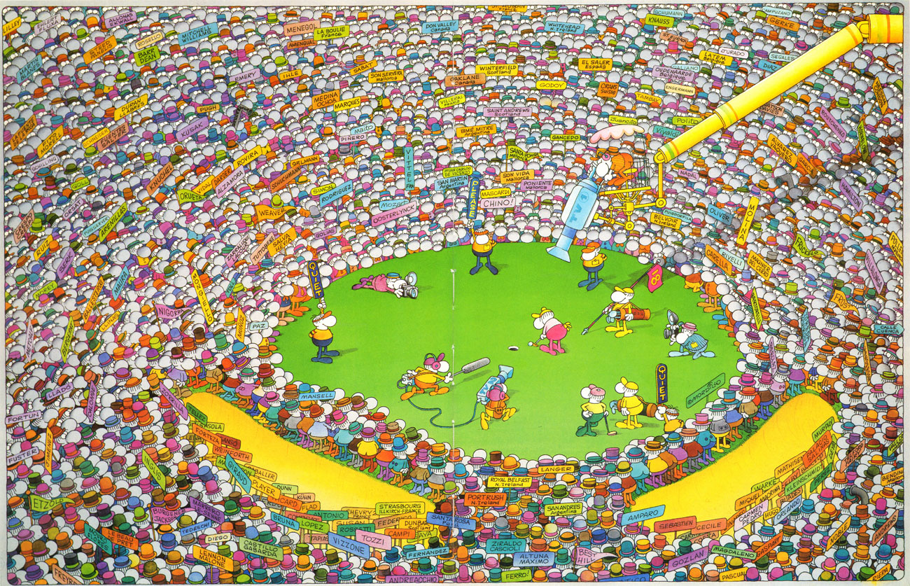 Mordillo always worked in pantomime, which made his cartoons understandable to people of all ages, across all languages. Many consist of one panel, usually providing a wide panoramic bird eye's perspective view of a surreal situation. One of the most iconic is 'The Individualist' (1973), which features a grey town where one man is taken away by the police for painting his roof in bright colors. Another well known cartoon, 'And Now?' (1981), shows a football team on a huge rectangular island in the ocean whose ball has just fallen into the water, several miles below. Other cartoons are actual gag comics, typically three to six panels long. His most famous works revolve around sports. He made dozens of drawings of cyclists, golfers and footballers, typically encountering exotic animals or sporting in absurd locations. Many were compiled in thematic books, such as his 1981 book 'Football', which had a foreword by football legend Pelé. Most people have first encountered Mordillo through his football-themed cartoons, which were often reprinted whenever a new edition of the World Championship Association Football was held. Particularly in the 1970s and 1980s, his art was used on an assortment of merchandising, including calendars, cups, greeting cards, stuffed animals, posters and especially puzzles.