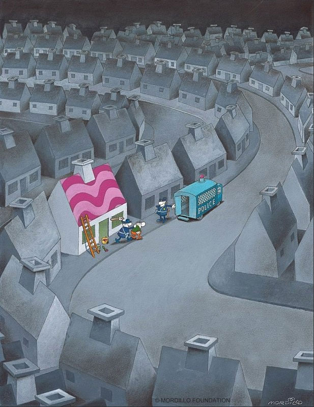Many cartoons by Mordillo show people and animals trying to make the best of their existence. Nobody stands out in the crowd. The artist once said: "My cartoons aren't sad, but melancholic. I'm a melancholic man. Every day I see and hear horrible things in the news. People suffer too much. That's why I draw cartoons, to prevent me from crying. It's a defense strategy. I defend myself with comedy and hope I can help other people too to defend themselves against sadness." He used his talent for humanitarian causes, such as Amnesty International. A 1989 exhibition in La Palma, Mallorca, was held to bring money together to help autistic children on the island.