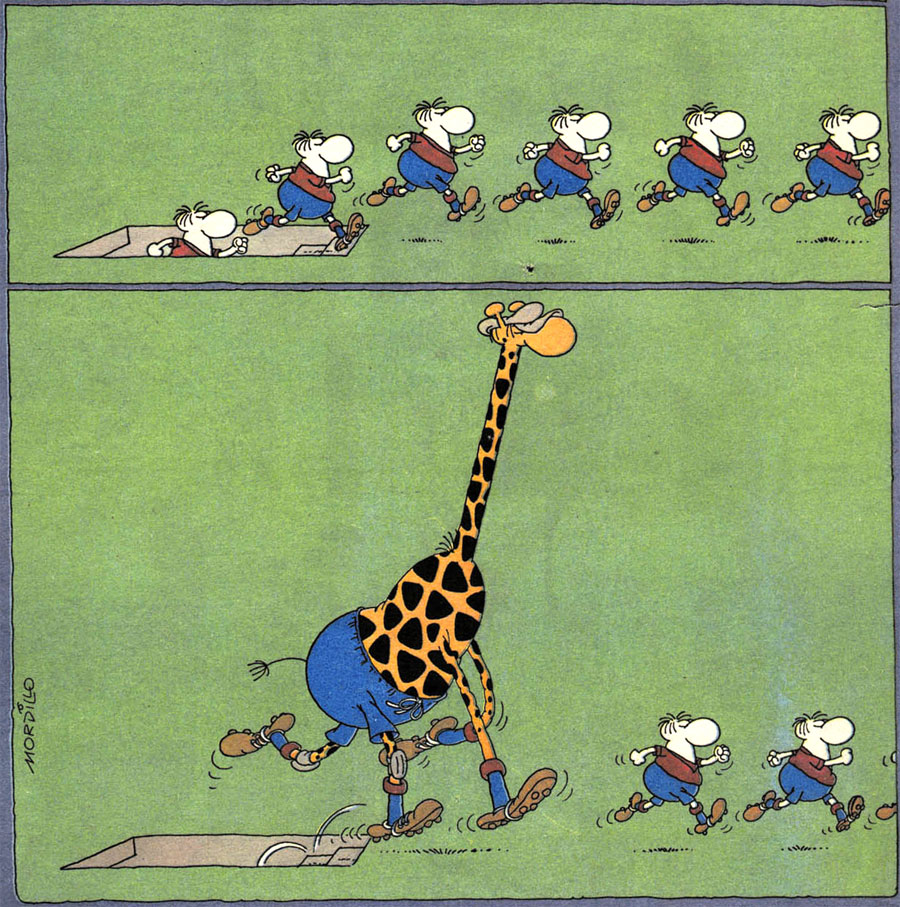 Guillermo Mordillo was an Argentinian cartoonist who rose to prominence during the 1970s and 1980s. His cartoons frequently feature surreal situations, often involving sports such as cycling, golf and association football. Big-nosed white men and women and goofy-looking giraffes are recurring characters. His dialogue-free cartoons easily destroyed all language barriers. His work has a poetic quality, which helped him become a global success. Mordillo won numerous awards and his work was the subject of heavy merchandising, including animated cartoons. At the height of his success, he was one of the most popular and instantly recognizable cartoonists in the world. In terms of global fame, he is arguably the most significant Argentinian comic artist of the late 20th century, along with 'Mafalda' creator Quino.