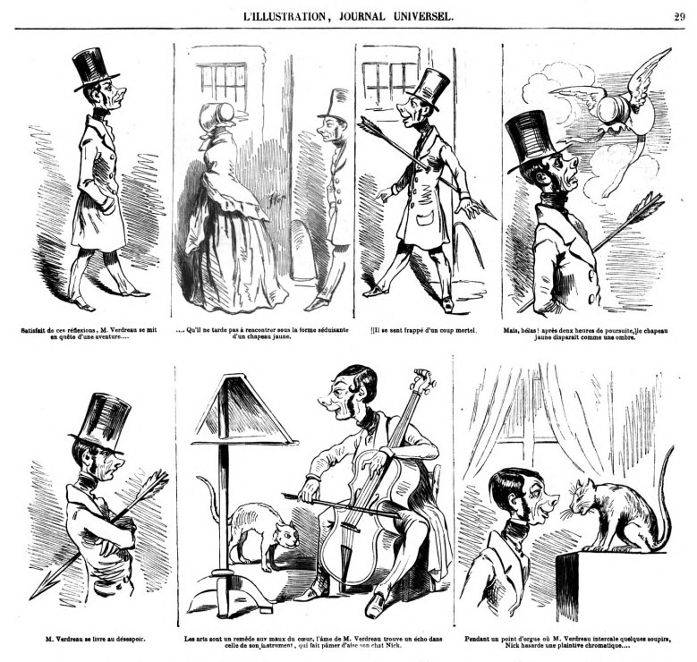 As a caricaturist, Morel-Retz worked for Le Charivari, Le Journal Amusant, Le Journal Pour Rire and L'Illustration under the pseudonym Stop. Between 12 January and 8 February 1850 he created a comic strip for L'Illustration named 'Les Aventures de Monsieur Verdreau', which ran in five consecutive issues. Up to that point the magazine preferred gag cartoons and caricatures. Comics were still a novelty, yet readers enjoyed the bumbling adventures of Mr. Verdreau well enough to convince the editors of L'Illustration to create more room for comics in the magazine's pages. Interestingly enough, 'Mr. Verdreau' was plagiarized a couple of times. In August 1850 the Portuguese cartoonist Flora (probably Nogueira da Silva) recreated the same story under a different title: 'Aventuras Sentimentais e Dramáticas do Senhor Simplício Baptista', which appeared in the magazine Revista Popular. The same comic reappeared again on page 4 of issue #74 (29 May 1869) of another Portuguese magazine A Vida Fluminense, yet this time unsigned and under the slightly different title 'Os Amores do Sr. Barnabé'.