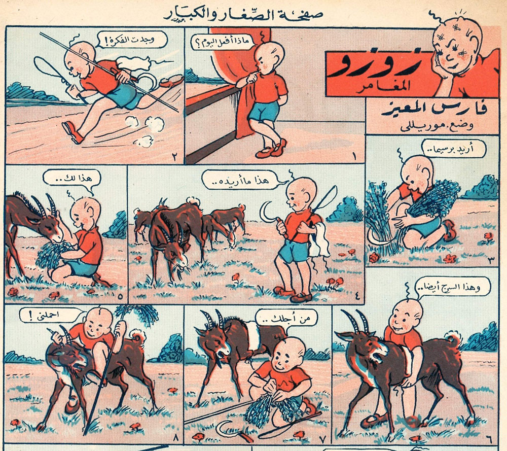 The Italian-born artist Mario Morelli di Popolo spent most of his life in Egypt, where he was an illustrator for textbooks and magazines. For Sindibad magazine, he created 'The Adventures of Zouzou' (1952-1960), the first comic series in Egyptian history.