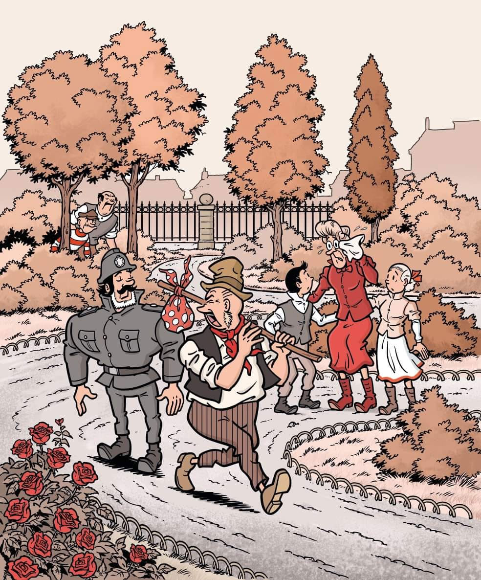 The new team was specifically instructed to bring the 'Suske en Wiske' series back to its familiar roots as an entertaining but conventional family comic. This way, the publisher hoped to appeal to young readers as much as nostalgic adult fans. Just like in the old days of Willy Vandersteen and his direct successor Paul Geerts, straightforward gags and adventure became the comic's hallmarks again, with a bit of social awareness and fantasy added to the mix. The main characters - Suske and Wiske, aunt Sidonia, goofy Lambik and superstrong Jerom - drove the narratives again, while secondary characters from the early years occasionally returned, such as the childlike Van Zwollem, a favorite of both Morjaeu and Van Gucht. Plotlines were based on folklore tales ('De Joviale Gille' [2007] about the Gilles of Binche), historical events ('Het Lijdende Leiden' [2011], about the 1574 Siege of Leiden) or environmental themes ('Lambik Plastiek' [2019], about plastic in the oceans).