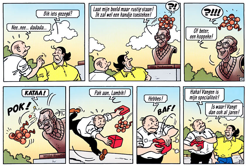 During the 1980s and 1990s, the Mormic team worked on commercial and advertising assignments, including Disney merchandising and artwork related to the Swiss claymation series 'Pingu'. At the height of their collaboration, the Mormic Studios had five people on staff. For the Belgian publishing company Zuidnederlandse Uitgeverij, Mormic made book covers, games and puzzles, while designing greeting cards for Hallmark. Their most prestigious and ambitious project was a four-volume comic book adaptation of Godfried Bomans' 1941 children's novel 'Erik, of het Klein Insectenboek' (1990-1992), again scripted by Yaack Bakker. In Belgium, the stories were serialized in Stipkrant, and in the Netherlands in Minitoe, the newspaper supplement of Courant Nieuws van de Dag. For Suske en Wiske Weekblad, Mormic created four short stories with the alien characters 'De Mormics' (1993-1994).