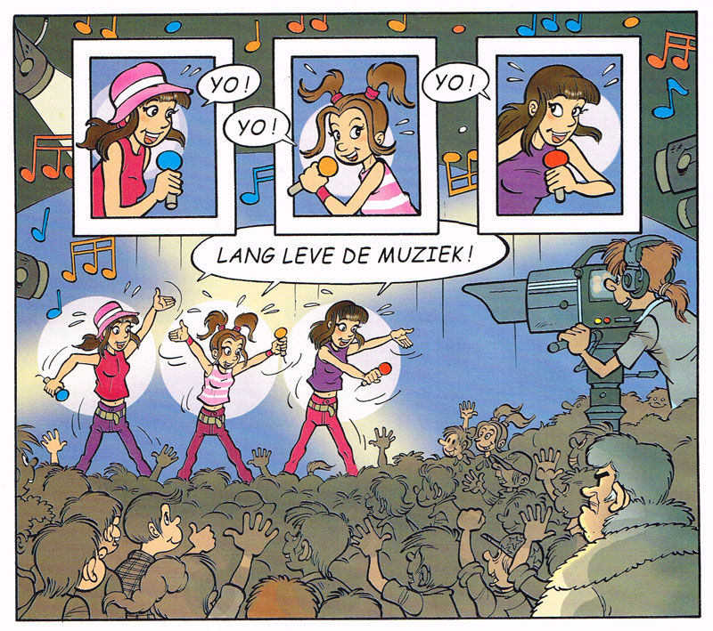 At the time, 'Jommeke' was published by De Stripuitgeverij, an imprint of the Belgian publishing company Dupuis. This publisher also hired Morjaeu to create the Flemish celebrity comic series 'M-Kids' (2000-2004), based on the girl group of the same name. Jan Ruysbergh (who also wrote scripts for 'Jommeke' and the celebrity comic about another popular girl band, K3) scripted the first album, while the other episodes were written by Morjaeu in collaboration with Peter Van Gucht, who was also one of the songwriters for the M-Kids. Bruno Verschelden provided the inking. In total, six albums were released.