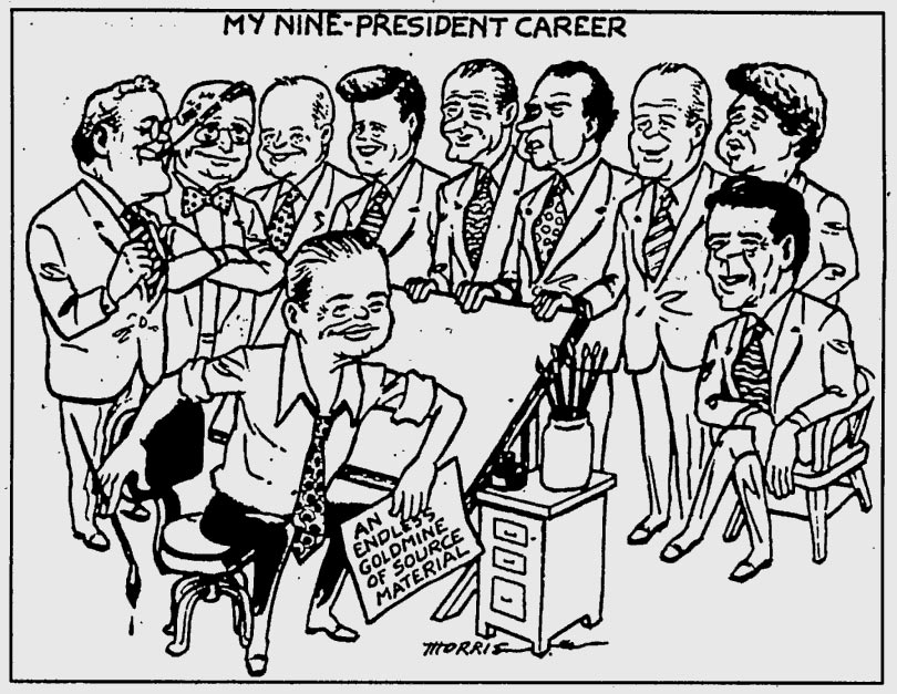 Morris' long editorial career took off in 1931, at the New York Journal American. His breakthrough cartoon was made when Al Capone was convicted for tax evasion. In 1935, Morris joined the Associated Press, allowing his cartoons to be syndicated to over 125 daily newspapers until his retirement in 1987. From 1940 on, Morris also provided cartoons whenever his colleague Henry "Hank" Barrow was sick or on holiday. When in July 1949 Barrow left the syndicate to join the Omaha World-Herald in Nebraska, Morris became his official successor.