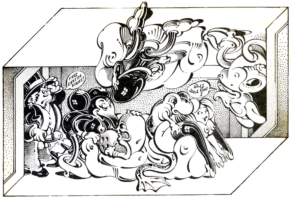 Born in Oleiros, Galicia (Spain), Moscoso had a formal academic art training at the Cooper Union in New York City and at Yale University. He moved to San Francisco in 1959, where he became an instructor at the San Francisco Art Institute, and where he gained success with his rock art created for local dance halls and clubs. At first Moscoso was hesitant to devote himself to comic strips. He was already spending the better part of a week designing two and sometimes three rock posters, which were printed on good paper, sold for a dollar, and therefore more tangible than the underground tabloids which were printed on cheap newsprint and destined for oblivion. Victor Moscoso worked mainly with Rick Griffin on his comix for Zap, alternating in drawing the panels.
