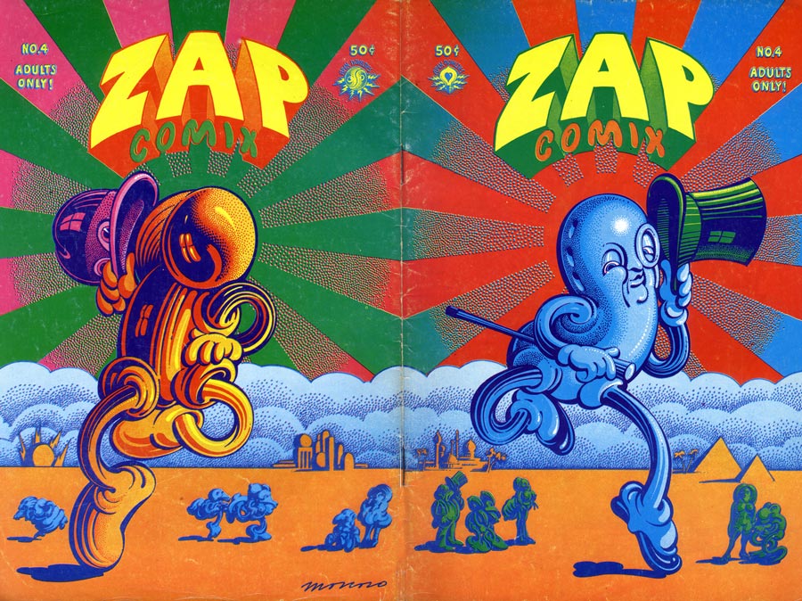 Victor Moscoso is one of the main artists of the early American underground comix scene. Although mainly known as an illustrator of covers of psychedelic rock posters, Moscoso was one of the most important artists of Zap Comix, the underground comic magazine started by Robert Crumb. Moscoso was present from the first issue of Zap in 1968, also using his trademark graphic style with vibrating colors, illegible lettering and vintage graphics in his comics.