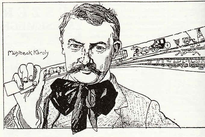 Károly Mühlbeck was an early-20th century painter, graphic artist and caricaturist, who spent most of his life in Hungary. He made cartoons, both single panel or sequential, for a great many magazines, but he was mostly associated with Borsszem Jankó and Új Idők. For the latter, he made his famous "Mühlbeck headlines" (1903-1943), in which he commented on the news of the day.