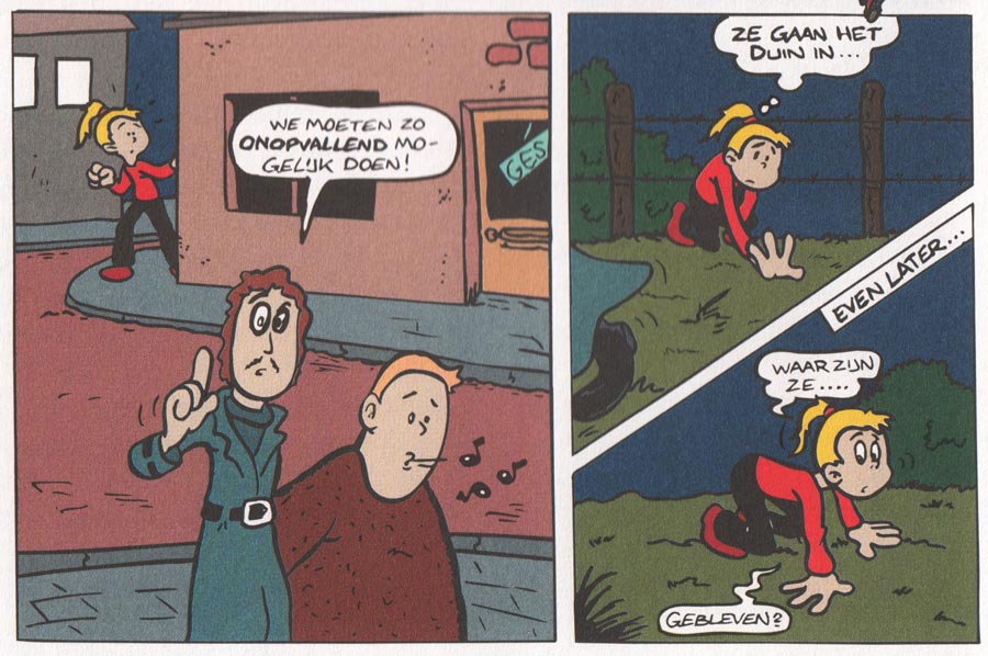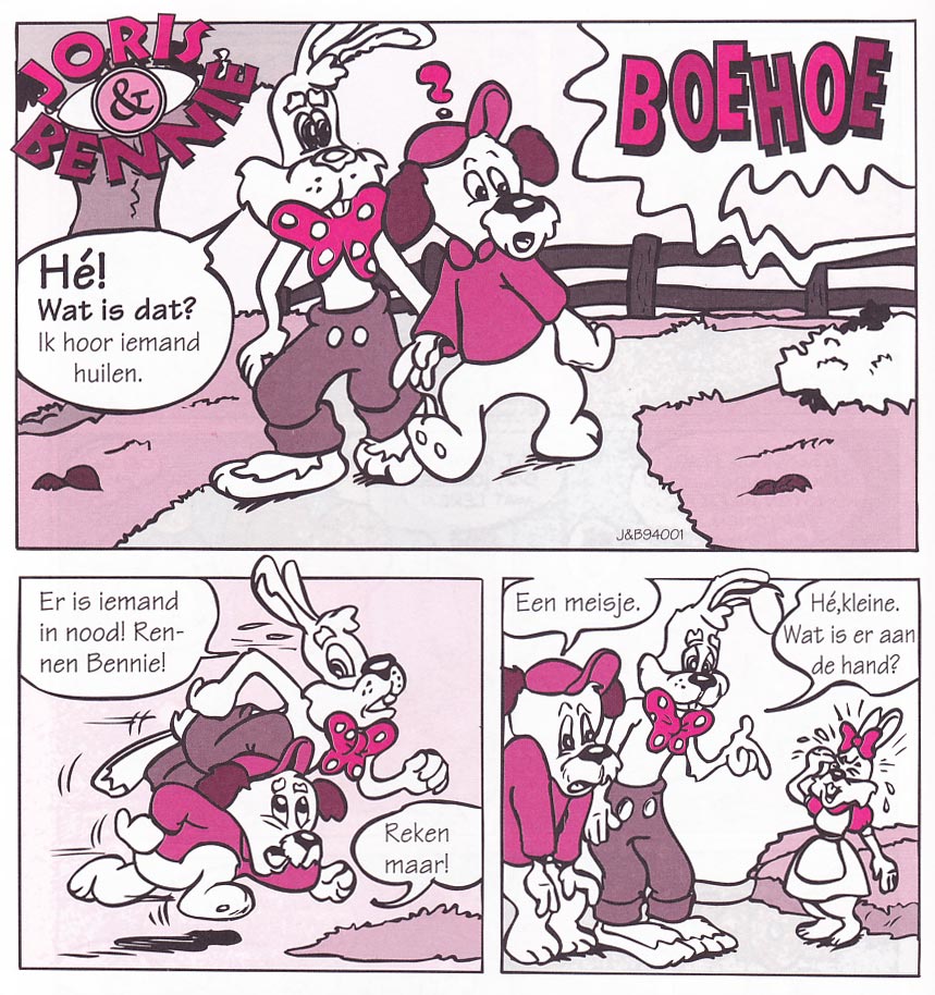 For De Denker; Van Munster was the editor for the short-lived children's magazine Happy voor Kids (1994-1995), which consisted of comics, puzzles and other activity pages. Together with fellow artist Dirk Arend and scriptwriter Koos Verkaik, Henk van Munster took care of the comics and illustrations as well. The magazine's mascot was the elephant 'Olivier Flap' by Dirk Arend, who drew the core of the comics. Van Munster drew gag strips about 'Ome Hannus' and his dog Snoef, the funny animal duo Joris Koopkonijn (a rabbit) and Bennie Sennie (a dog) under the title 'Joris en Bennie', and the inventive kid 'Jopper', who also starred in cryptic puzzle strips. His other contribution was the adventure serial 'Roos en het Bunkermysterie', which spanned several issues. Joris and Bennie served as mascots for several of De Denker's other kids' puzzle publications.