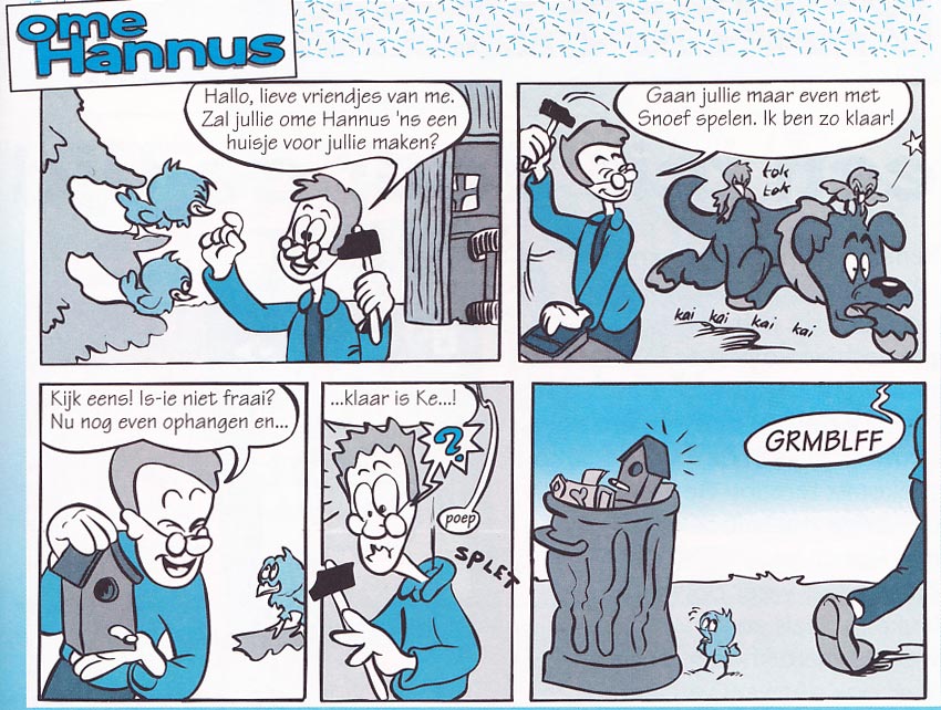 'Ome Hannus'. Ome Hannus builds a birdhouse, but throws it away once the birds shit on him.