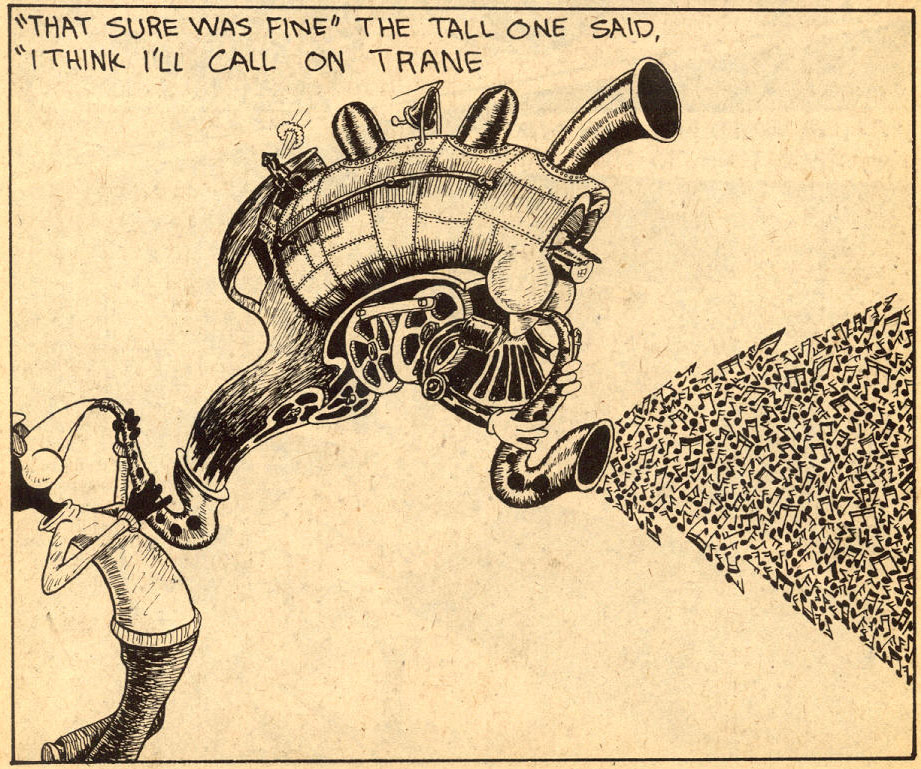 The only other contributor to Fuktup Funnies was an artist signing with the name Joe Arthur Potts, who used the characters of Ozzie and Lotta in two adventure stories, 'Beat Me Daddy 8 to the Bar' and 'The Visitation'. It should be noted that the hippie couple 'Ozzie and Lotta' weren't creations by Potts, but instead characters previously used by Robert Armstrong in L.A. Comics #1 (1971), Mickey Rat #1 (1972) and, later, in Comix Book #3 (1975). It has been argued that Joe Arthur Potts and Marty Nelson might be the same person, or that the comics were actually drawn by Robert Armstrong under a pseudonym. Fuktup Funnies indeed also features an anthropomorphic rat, not unlike Armstrong's Mickey Rat character, while in 'Mickey Rat', there is also a jazz musician based on Gillespie, named Dizzy Ratstein. However, on the website comixjoint.com, this theory is dismissed, given that Nelson and Potts' graphic styles are very different.