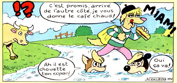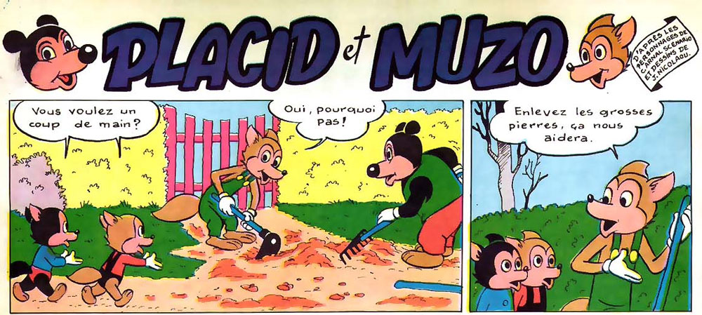 After three years of doing illustration work and game pages, Jacques Nicolaou took over the funny animal comic 'Placid et Muzo' from its creators, the writer/editor Pierre Olivier and the Spanish refugee artist José Cabrero Arnal. With his first gag published in the 14 November 1958 issue (Vaillant #705), Nicolaou became the series' writer and artist for decades to come. Set in a Disneyesque cartoon world, the main characters are a lazy bear (Placid) and a cunning fox (Muzo), while the secondary cast of characters consists of dogs, goats, horses, monkeys, elephants, hippopotamuses, rhinos and ostriches. Appearing in both gags and longer stories, Placid and Muzo encounter recurring villains like the wolf Bulldog and the gorilla Grosses Narines, as well as allies such as the genius professor Grostalent, who can let the heroes travel through time. Apart from these Arnal-Olivier creations, Nicolaou expanded the cast with Muzo's resourceful nephews Riri and Fifi, Placid's panda nephew Tib, their freeloading dog friend Mecton and the sporadic human characters, Monsieur and Madame Tout-le-Monde. Under Nicolaou's reign, the poetic undertone of the Arnal era and the doggerel verses of Pierre Olivier were dropped, and the series turned to a more simplistic graphic and narrative style.