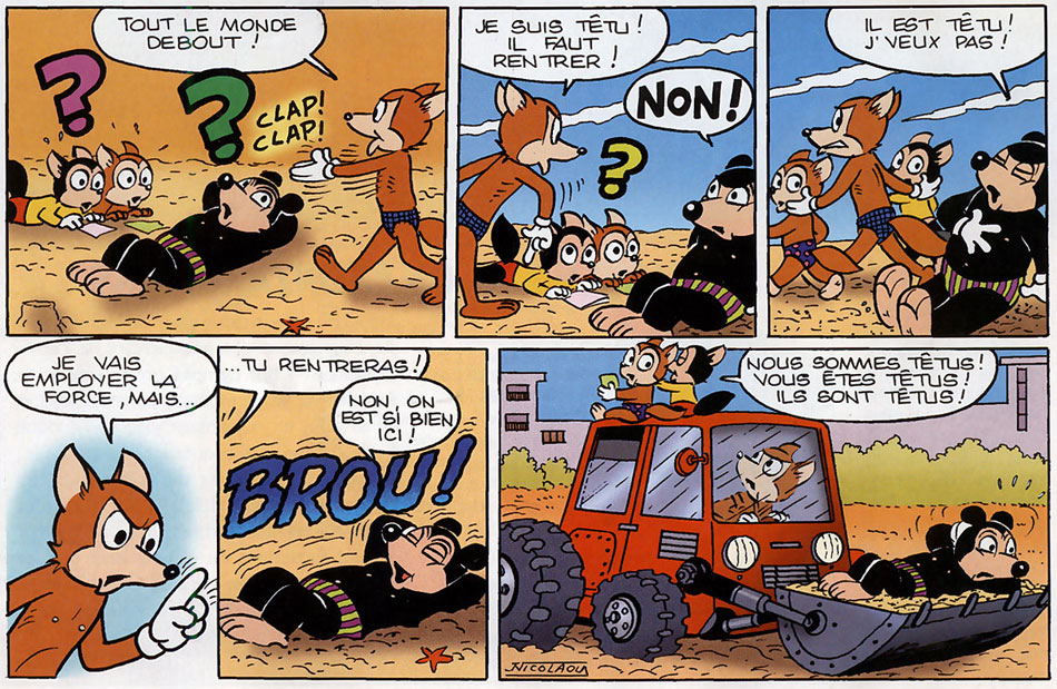 While drawing 'Placid et Muzo' in Vaillant and its successors Le Journal de Pif and Pif Gadget, Nicolaou also created stories with his bear and fox characters for the pocket book series 'Placid et Muzo Poche' (1964-1993). For Vaillant's children's collection 'Les Rois du Rire', he created spin-off booklets with Tib (1976-1980). In 1985, Nicolaou's regular tenure on 'Placid et Muzo' in Pif Gadget came to an end, after which Michel Motti became the lead artist of new stories until the magazine's (first) disappearance in 1993.