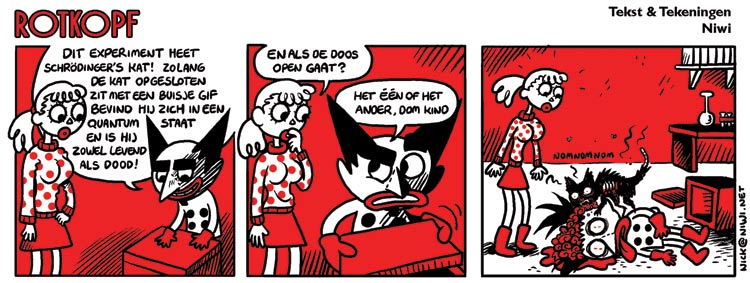 Rotkopf, published on the online platform Stripster in 2009. Translation: "This experiment is called 'Schrödinger's cat'. As long as the cat is locked inside with a tube of poison, he is in a quantum state and both alive and dead." - "And if the box opens?" - "Some or other dumb kid."