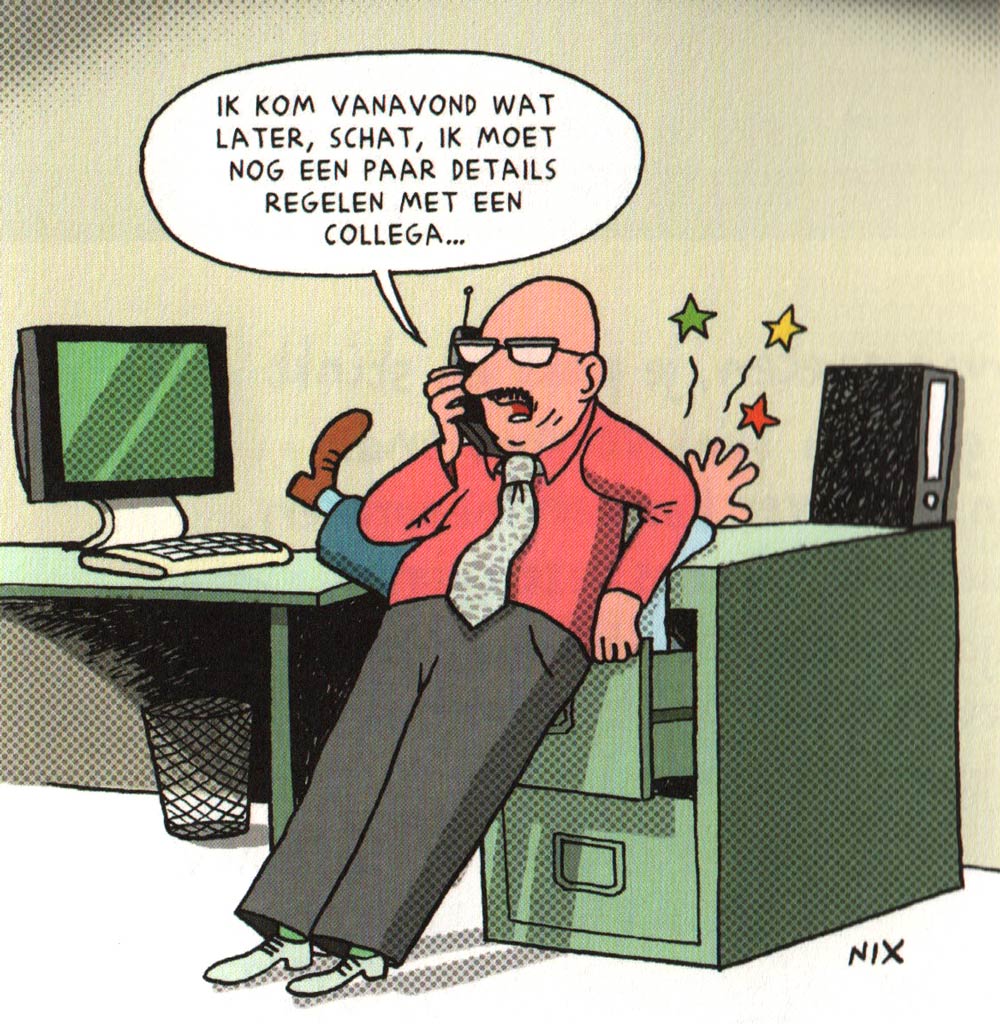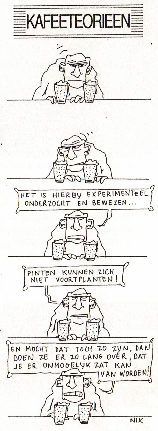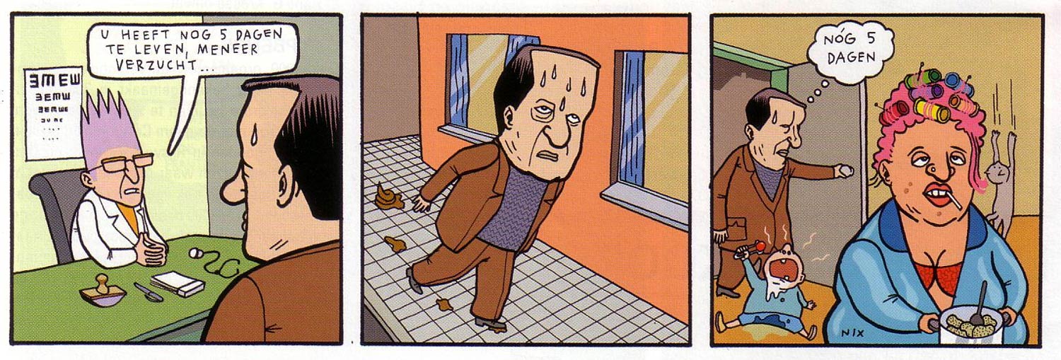 Nix eventually got the opportunity to make a career move and become a cartoonist after all. As luck would have it, Nix' cartoons for the student magazine Veto were noticed by Johan Mortelmans, editor of the daily newspaper De Standaard. He invited him to create gag comics and cartoons for the paper's economic section, under the title 'Café du Commerce'. In 1994, boosted by this experience, Nix also presented his work at the Brussels offices of another newspaper, De Morgen. He joined the team of the paper's youth supplement DeMix, a breeding ground for Flemish journalistic talent. Fellow cartoonists Kim Duchateau, Mario Boon, Vero Beauprez and Stief Desmet were also part of the team.
