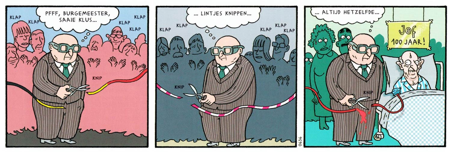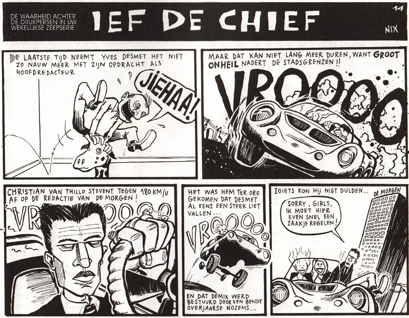 At DeMix, Nix initially made covers, illustrations and an occasional cartoon. When in 1997 the team moved over to the Antwerp division of the paper, he launched a new comic strip, 'Ief de Chief' (1997-1998). It was a hilarious and daring parody of the tensions between the commercial and editorial divisions of the De Morgen newspaper. The comic depicted Yves Desmet, editor-in-chief of De Morgen, as a glamorous man driving a sports car, and also poked fun at Christiaan van Thillo, head of the Persgroep media concern. Although Nix bit the hand that fed him, 'Ief de Chief' managed to run for about a year. In 1998, it was even published in comic book form, accompanied by an 'Ief de Chief' jumping jack.