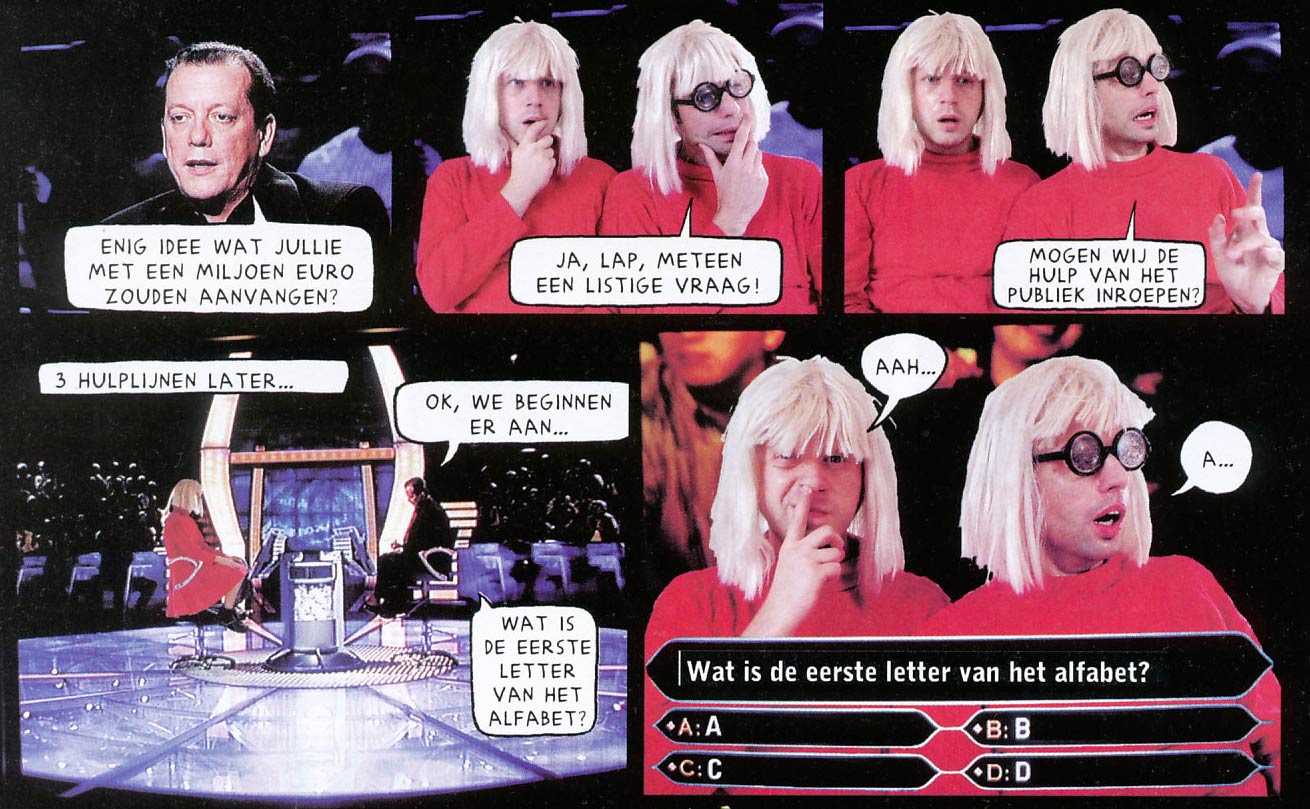 Kinky & Cosy photo comic parodying the Flemish version of the TV game show 'Who Wants To Be A Millionaire?' with host Walter Grootaers. The part of Cosy is played by Bart Schoofs, while Kinky is portrayed by Nix.