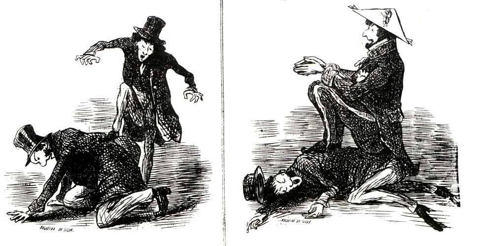 If he was indeed the artist behind the pseudonym Flora he created what is widely considered to be the first Portuguese comic strip: 'Aventuras Sentimentais e Dramáticas do senhor Simplício Baptista', which appeared in issue #18 of Revista Popular on 3 August 1850. The comic strip, published with the text underneath the images, centers around the disastrous love story of an unlucky bachelor, M. Simplício Baptista. As important as this publication is for Portuguese comic history, it was unfortunately shamelessly plagiarized from French artist Louis Morel-Retz, aka Stop, who made the same story eight months earlier under the original title 'Les Aventures de Monsieur Verdreau' (1850) for L'Illustration, Journal Universel. Interestingly enough Flora wasn't the only Portuguese to plagiarize Stop. The same comic reappeared again on page 4 of issue #74 (29 May 1869) of the Brazilian illustrated magazine, A Vida Fluminense, yet this time unsigned and under the slightly different title 'Os Amores do Sr. Barnabé'.