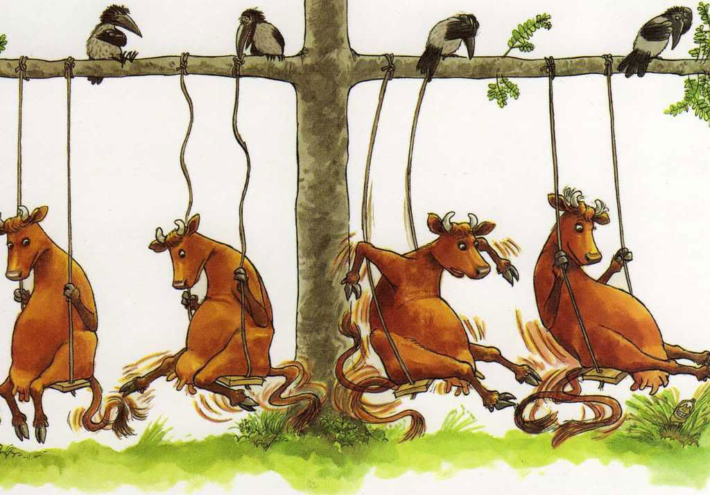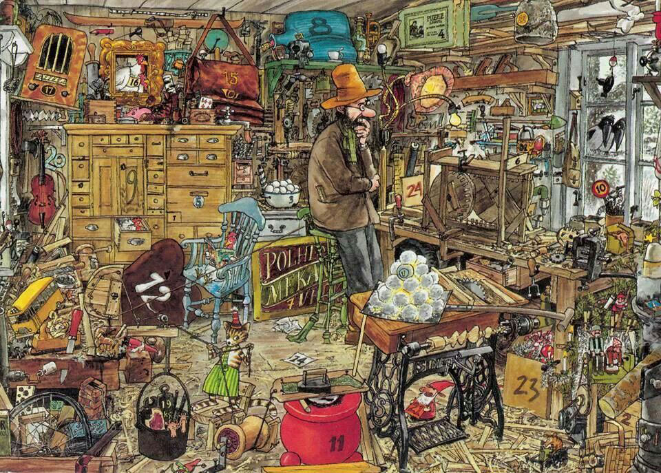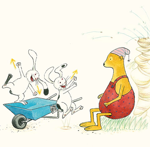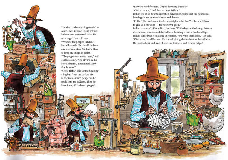 The 'Pettson and Findus' stories feature a lot of puns. Another delight are Nordqvist's busy, detailed and atmospheric drawings. He often draws idyllic scenes of nature and countryside life, inspired by his own childhood memories. Pettson and Findus go out camping, fishing or strolling in the woods. Their house has a charming, nostalgic look. Pettson's red-painted home is worn out. His toolshed, kitchen and garden are cluttered with dozens of individual objects, leaving readers to spot dozens of funny and intriguing details. When Pettson works, Findus is usually playing around, while the Mucklor are setting up pranks. To indicate the passing of time, Nordqvist often draws them several times within the same illustration, making a sequence comparable to comic art. Interviewed by Editorial Flamboyant in November 2010, the illustrator explained: "Maybe my characters look like comic book characters because they are sketched, contrary to other artists, who follow more traditional artistic drawing styles. Sometimes I use kinetic lines and vignettes to show rapid movements. I use it because it works, although it contributes to the idea that my illustrations cannot be considered art. The fact that Pettson or Findus sometimes appear several times within the same illustration is perhaps reminiscent of film. To me it's a way to expand a scene in space and time without using more than one page. Or to give an impression of fast actions."