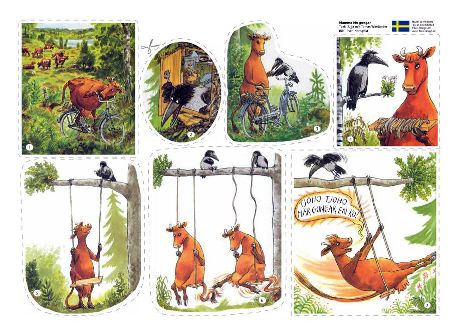 Since 1991, Sven Nordqvist additionally is known as the illustrator of Jujja and Tomas Wieslander's children's book series 'Mama Mu och Kråkan', about a cow and a crow. The characters originated in a children's radio show, 'Kråkan och Mamma Mu' (1990), broadcast on Sveriges Radio P3. Jujja Wieslander voiced Mamma Mu, while Anders Ågren voiced Kråkan. The animal duo caught on and was adapted into various commercial products, including pillows, video games, a 2008 animated film, a 2009-2010 animated TV series and audio plays. Since 2015, a 'Mamma Mu och Kråkan' comic book series, written by Jujja Wieslander with the illustrator Micaela Favilla and colorist Elin Fahlstedt, has been published by Rabén & Sjögren.