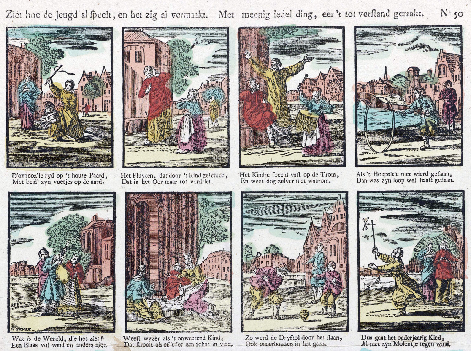 Hendrik Numan was a productive woodcutter for prints. Some had one or two images, others followed the 16-panel structure of the traditional catchpenny prints. Printers that used Numan's woodcuts were the Widow Cornelis Stichter in Amsterdam, Jacobus Thompson in Rotterdam, Johannes Noman in Zalbommel and F. Holtkamp in Sneek. For a while, Numan also published prints himself, but with little success. In general, his woodcuts had much detail in the artwork, revealing an artist skilled in his craft. Some of his notable prints showed selections of crafts and professions, with some of the imagery directly based on engravings from the 17th century book 'Het Menselyk Bedryf' by Jan and Caspar Luyken. A series of prints for the printer Wendel, showing children's games, were directly based on another book by Jan Luyken, 'Des Menschen Begin, Midden en Einde'.