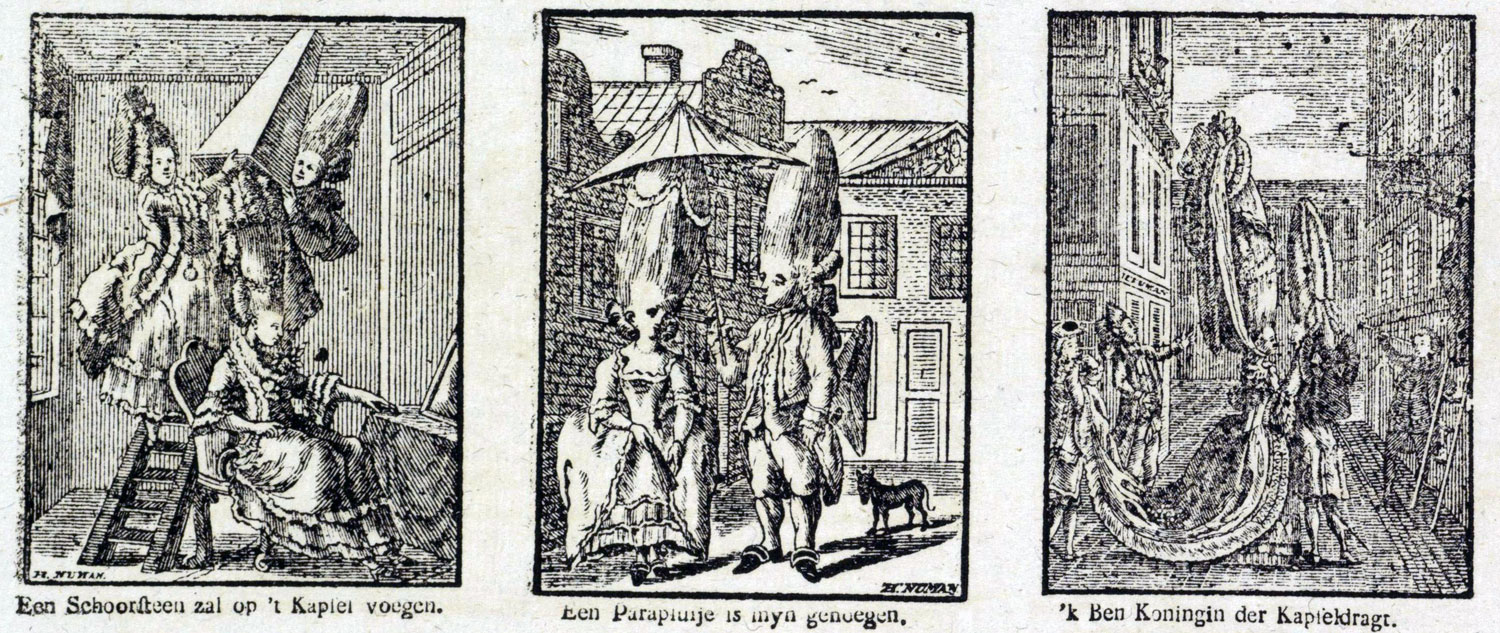 One of the most remarkable prints by Hendrik Numan (Noman print #216) spoofed the wigs of the wealthy, showing posh people with extremely eccentric hairstyles. For Stichter print #13, Numan used the same gimmick and showed people with big hairstyles, umbrellas and strange fashion. Another burlesque print by Numan was 'De Vernieuwde Jan de Wasscher', one of many remakes of the satirical take on the division of roles between men and women, starring the wimpy Jan de Wasscher and his demanding wife Griet. Instructed by his wife, Jan does all the household chores, including the raising of their child, and is often reprimanded for his clumsy behavior. Many artists of catchpenny prints created their version of Jan de Wasscher, often recreating the artwork from earlier prints. A 19th-century version is known with woodcuts by Alexander Cranendoncq.