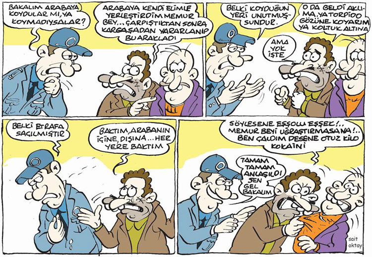 Turkish cartoonist Sait Oktay was born in 1964 in Bursa-Mudanya. He published his first drawing in Gırgır, at the age of 16, being a pupil of Oguz Aral. He has since contributed to several other magazines, such as Fırt, Avni and Dıgıl. He also co-founded magazines like Çuvaldız and Gülmece-Bilmece.