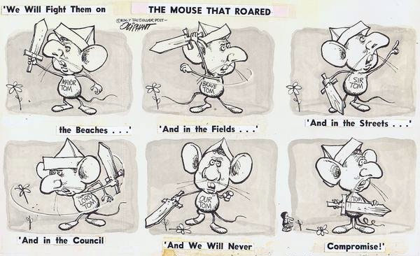 1967 cartoon by Pat Oliphant, depicting U.S. politician Tom Currigan, who was mayor of Denver, Colorado.