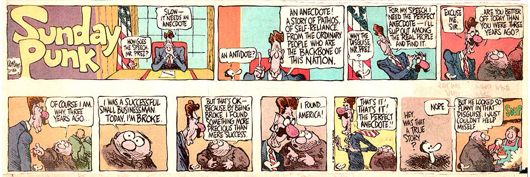 'Sunday Punk' strip of 25 March 1984, referencing U.S. President Ronald Reagan's piercing question to potential voters during the upcoming Presidential elections: "Are you better off now, than three years ago?".