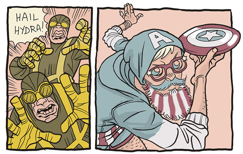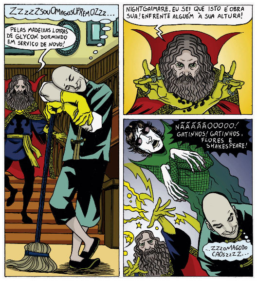 Since 2015, Caio has published humor and parody comics on the Facebook page 'Cantinho do Caio' ('Caio's Corner'). Other parody works were self-published through crowdfunding, like the comic book was devoted to one of the artist's favorite authors, the British graphic novelist Alan Moore. 'Alan Moore: o Mago Supremo' (2015) portrays the writer as a real wizard similar to Marvel's 'Dr. Strange', and his interactions with other comic authors, including his "arch enemies" Grant Morrison and Neil Gaiman. It was followed by 'Panza' (2015), starring Don Quixote's friend Sancho Panza, 'All-Hipster Marvel' (2015), portraying Marvel Comics heroes as hipsters, and 'Rlyeh-Boy' (2017), a "mash-up" of Mike Mignola's 'Hellboy' and H.P. Lovecraft's Cthulhu.