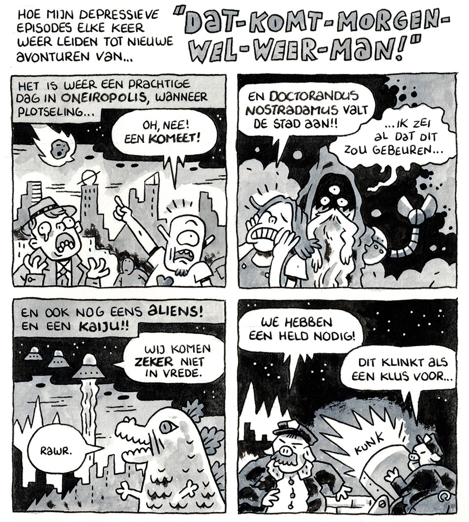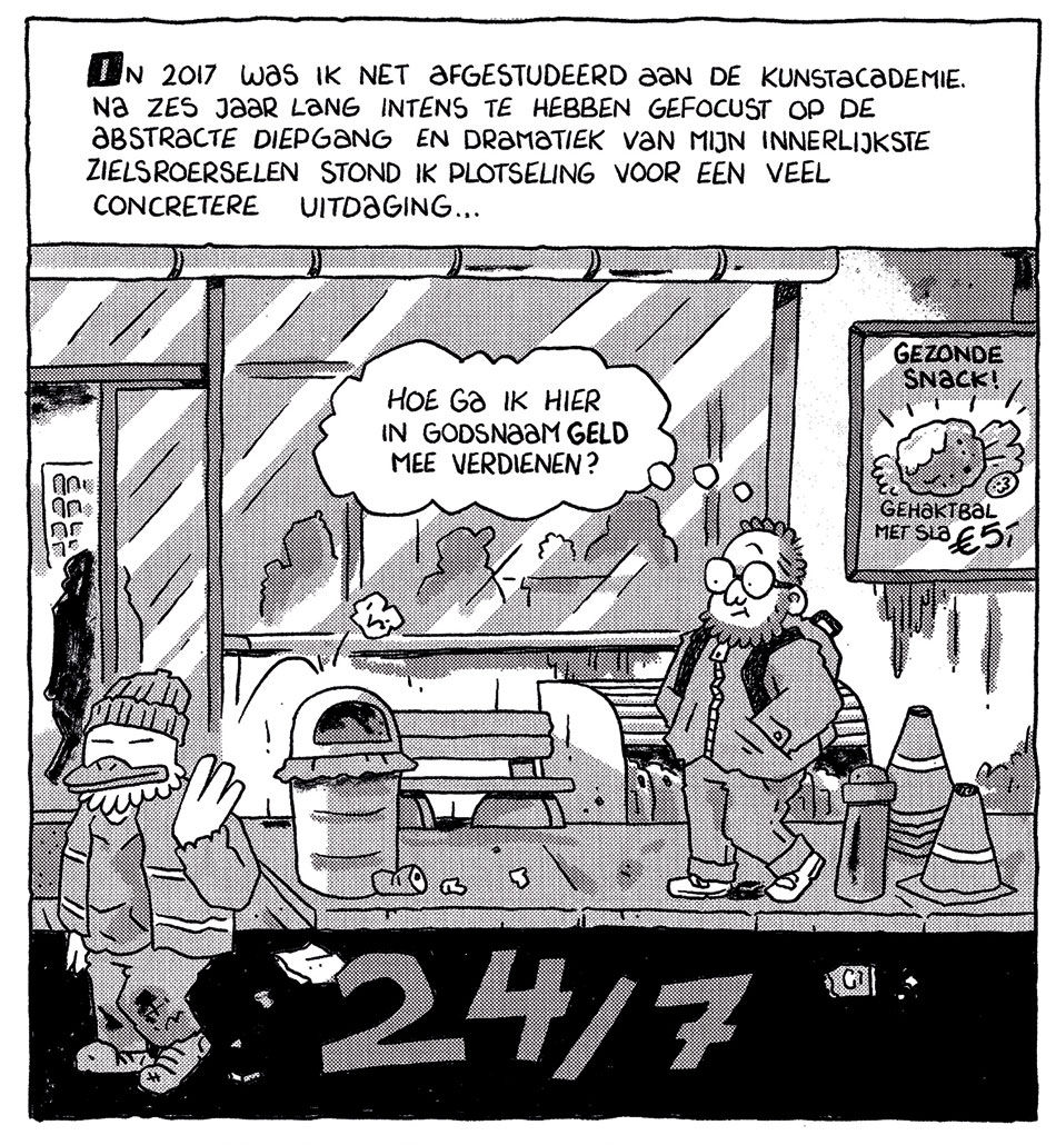 After graduation, he spent several years creating little to no comics, attempting instead to work as an editorial illustrator. During this period, his artwork has appeared in De Optimist magazine and in newspapers like De Volkskrant and De Stentor. In 2019, he also designed the record sleeve for 'Ruins of Tomorrow', the first EP of the band Postmaster General.