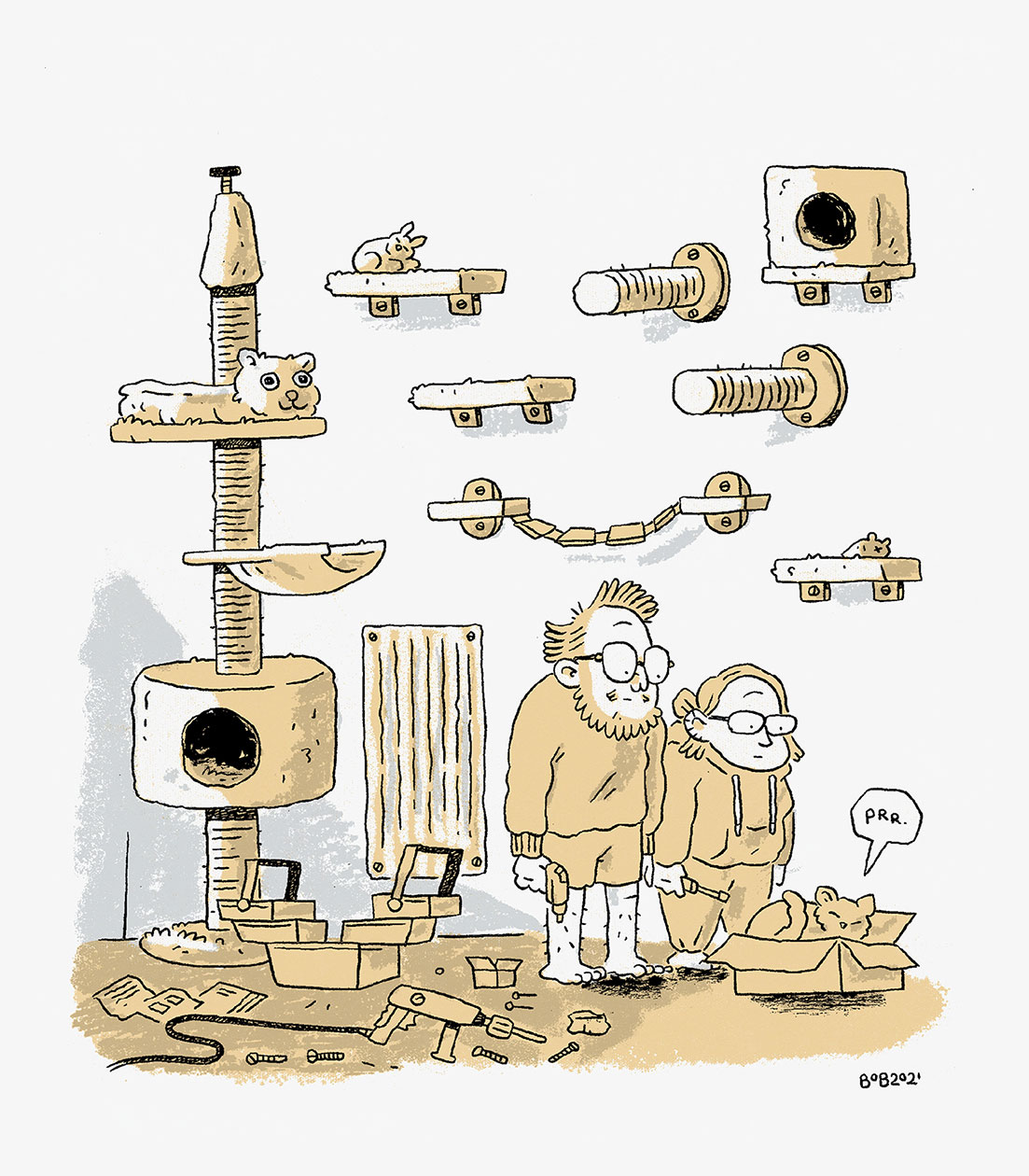 Besides his self-published autobiographical comics, Bob Op 't Land's comics and illustrations have appeared in a variety of magazines and newspapers. He has regularly contributed comic stories, gag strips and centerspread illustrations to the pop cultural magazines Schokkend Nieuws and Zone 5300, the Groningen-based comic anthology Gr'nn and the alternative children's magazine Brul!. In 2023, he contributed two game pages to the Belgian comic magazine Spirou, and in the following year, his story 'L'Oiseau, le Serpent et le Chat' appeared in a special cat-themed issue of Métal Hurlant magazine. In his spare time, he enjoys creating elaborate, improvised drawings in his sketchbooks with ink and watercolor.