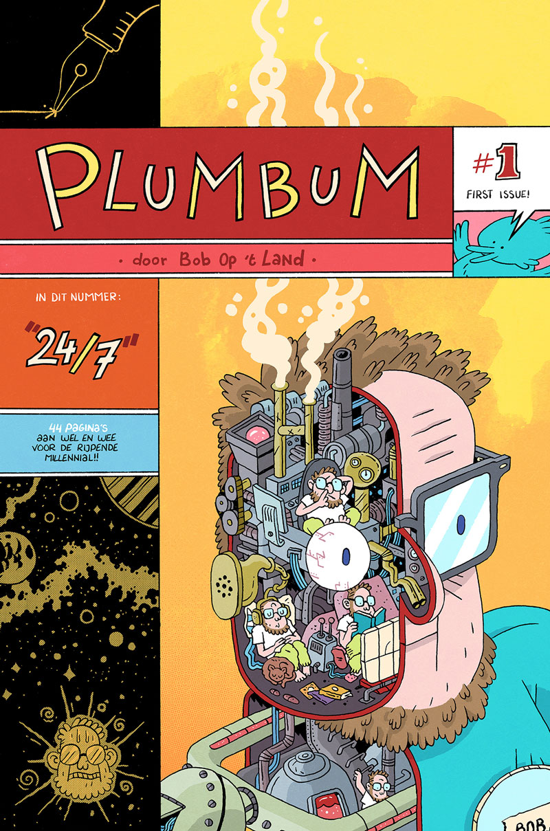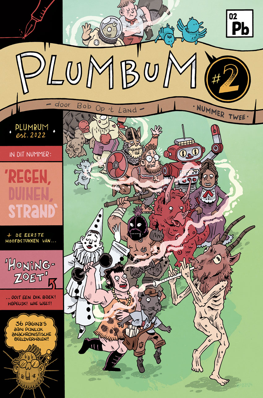 Bob Op 't Land is a Deventer-based Dutch comic creator, who has published his autobiographical comic stories on Instagram and in his 'Plumbum' anthology series (2022- ). His comic strips and crowded, playful and absurd overview illustrations have appeared in magazines like Schokkend Nieuws, Zone 5300, Brul! and Spirou.