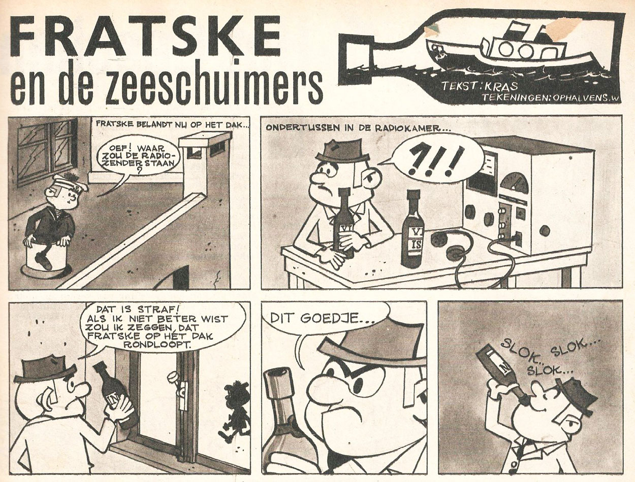 Trained by Berck, Ophalvens also made illustrations for Tintin/Kuifje and comics for Ons Volkske, using the pen name Wili. Between 1962 and 1964, he drew three serials about 'Fratske', a sailor who helps the honest and the needy on his travels. Written by Kras, the first serial was called 'Fratske en de Zeeschuimers', and commenced publication in Ons Volkske on 26 July 1962. It was followed by 'Fratske en de Juwelen van Chiva' (1963-1964) and 'De Blauwe Vis' (1964).