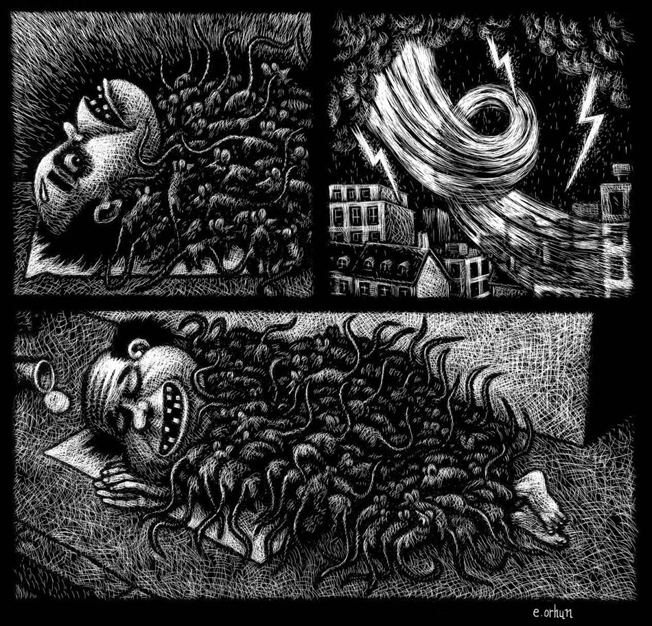 For a long time, Orhun was perfectly content with being a book illustrator, despite friends' efforts to convince him to work for newspapers. One day, he decided to apply to the newspaper Libération just for the heck of it and was given two articles to illustrate. Being used to working slowly and in a detailed style, Orhun found it difficult to make a simple, striking image within a short timespan. But he eventually liked the challenge and became one of the regular contributors to Libération, later also appearing in Le Monde.