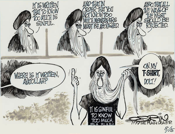 Cartoon of Ayatollah Ruhollah Khomeini from the Cleveland Plain Dealer of 15 August 1979.