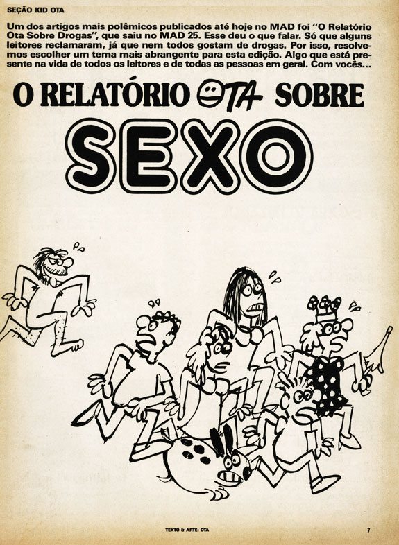During Record's run of Mad, Ota created one of his best known features. The 'Relatório Ota' ("Ota Report") was a mix of drawings and text with fake nonsense stories about a wide variety of subjects. The first one (about sex) was published in Record's Mad #27 (February 1987). Almost every subsequent issue of Mad contained a 'Relatório Ota'. In 2010, LeYa/Barba Negra published 'O Relatório Ota do Sexo', a 128-page book with a new and expanded version of the sex report.