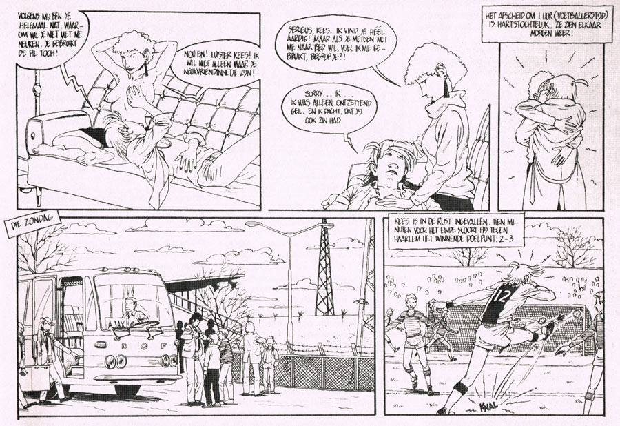 Van de Oudeweetering graduated from the Rietveld Art Academy in 1979 and made his comics debut with the first installments of his story 'Bink bij Ajax' in Supergum in 1980. The complete story, about the young football player Kees de Jonge in a world full of sex, corruption, booze and cars, was written by former sports journalist Henno Eggenkamp and published in album in 1984. Van de Oudeweetering's further comics work include some one-pagers for Wordt Vervolgd in 1981, 'Erik Eek' for Teleac's Nieuws uit de Natuur and 'TWOgether' in the early issues of Hello You! in 1990.